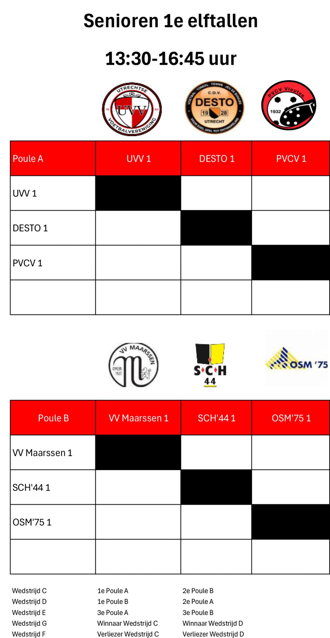 1e elftallen: DESTO, PVCV ,VV Maarssen , SCH’44 , OSM’75 en UVV