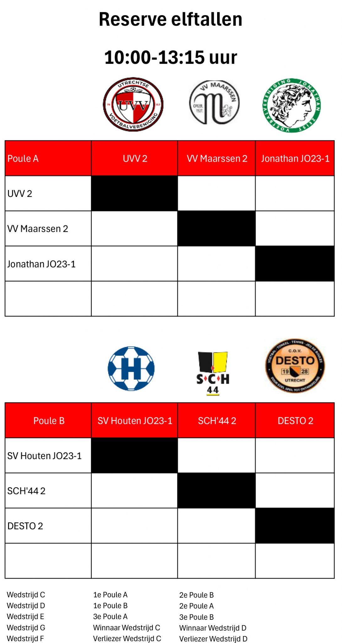 Reserve elftallen: DESTO 2, VV Maarssen, Jonathan O23-1, SV Houten O23-1, SCH’44 2, en UVV 2 .